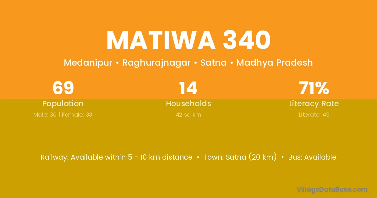 Satna (20 km) is the nearest town to Matiwa 340 village for major economic activities and is located approximately 20 km away.