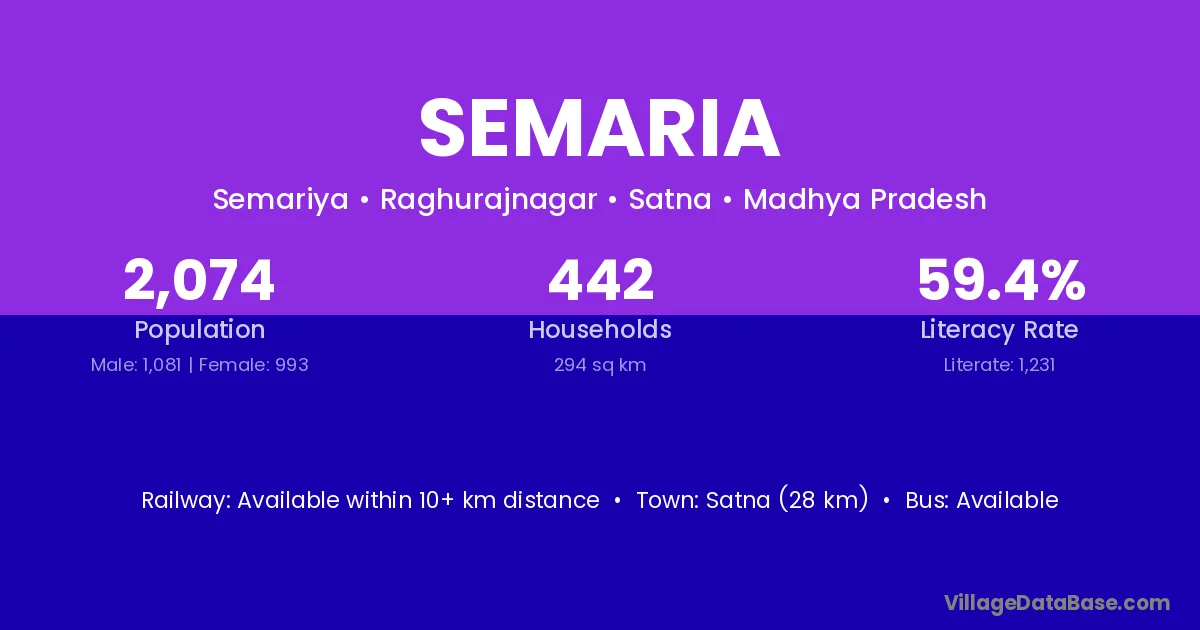 Satna (28 km) is the nearest town to Semaria village for major economic activities and is located approximately 28 km away.