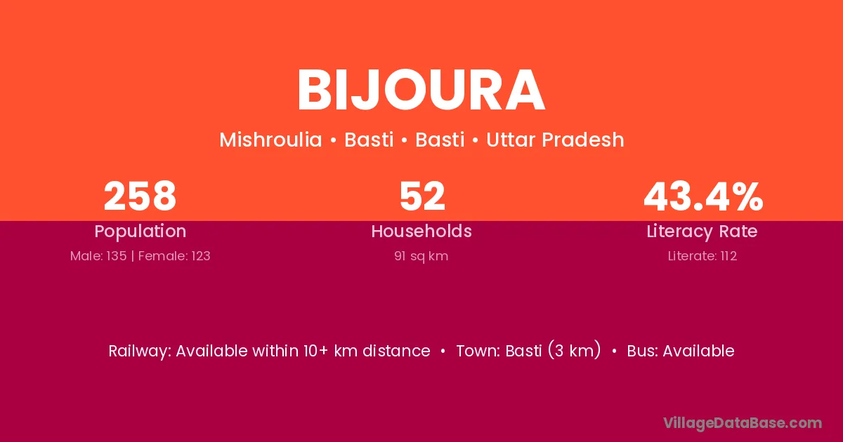 The literacy rate of Bijoura village is 53.67%. Male literacy stands at 63.91% and female literacy at 43.80%.