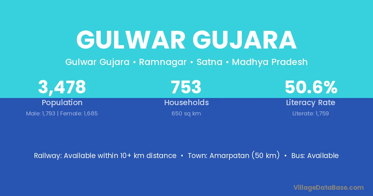Gulwar Gujara village has a total population of 3,478 people, of which 1,793 are males and 1,685 are females.