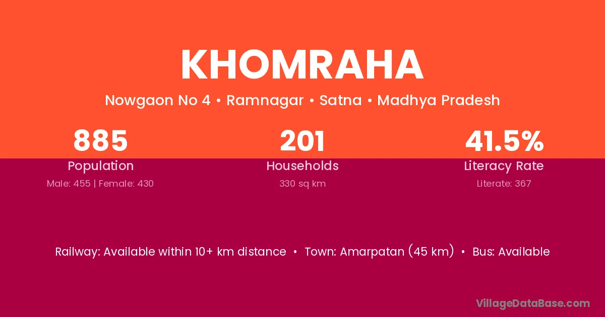 Khomraha village has a total population of 885 people, of which 455 are males and 430 are females.