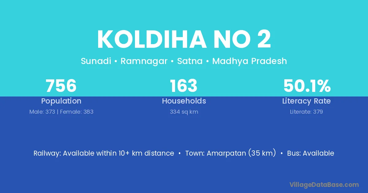 Amarpatan (35 km) is the nearest town to Koldiha No 2 village for major economic activities and is located approximately 35 km away.