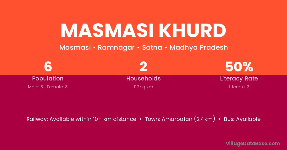 Masmasi Khurd village has a total population of 6 people, of which 3 are males and 3 are females.