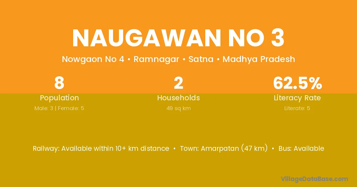 Naugawan No 3 village has a total population of 8 people, of which 3 are males and 5 are females.