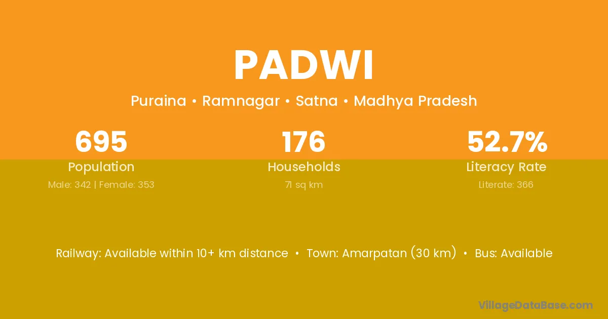 Padwi village has a total population of 695 people, of which 342 are males and 353 are females.