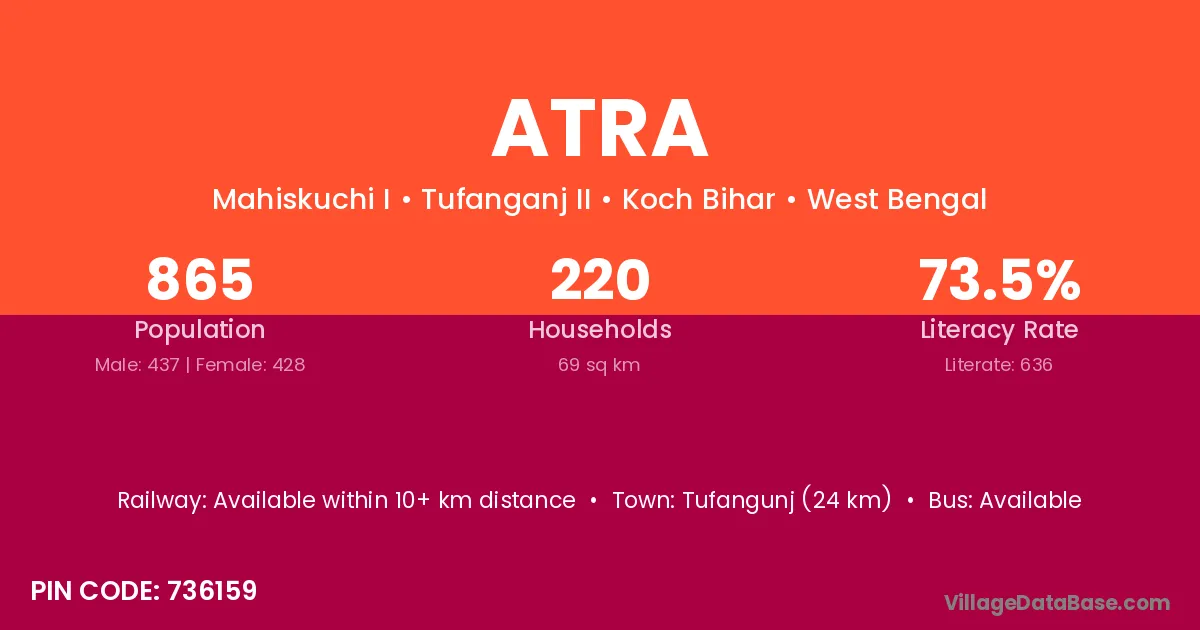 The literacy rate of Atra village is 67.63%. Male literacy stands at 76.76% and female literacy at 57.14%.