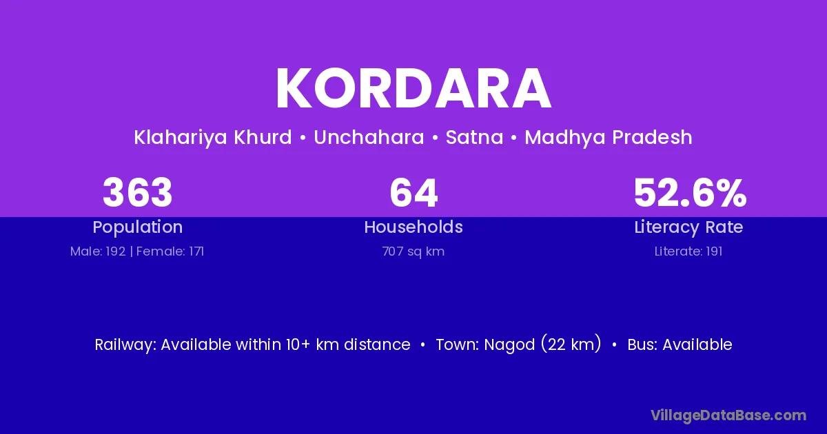 Nagod (22 km) is the nearest town to Kordara village for major economic activities and is located approximately 22 km away.