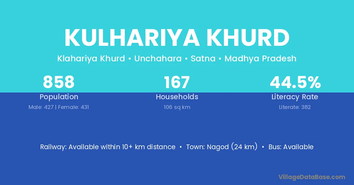 Nagod (24 km) is the nearest town to Kulhariya Khurd village for major economic activities and is located approximately 24 km away.