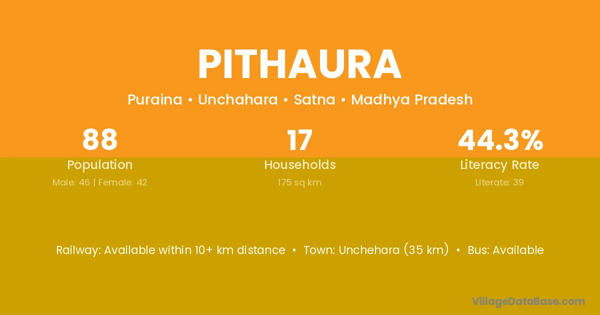 Unchehara (35 km) is the nearest town to Pithaura village for major economic activities and is located approximately 35 km away.