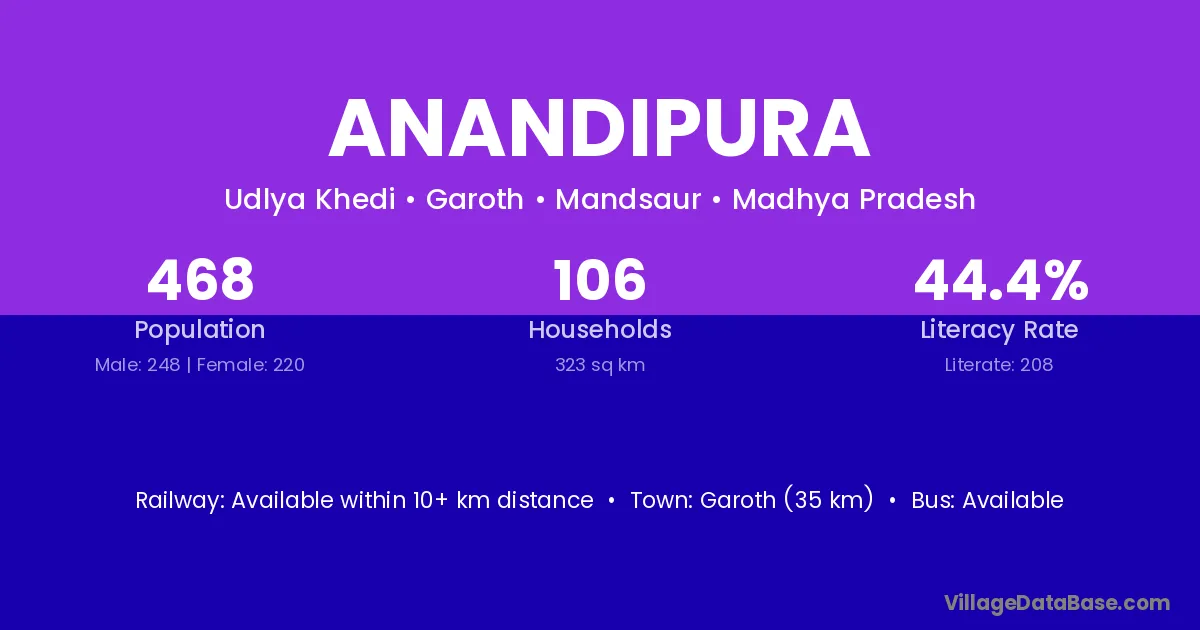 Ashta (6 km) is the nearest town to Anandipura village for major economic activities and is located approximately 6 km away.