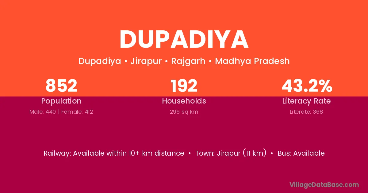 Ashta (8 km) is the nearest town to Dupadiya village for major economic activities and is located approximately 8 km away.