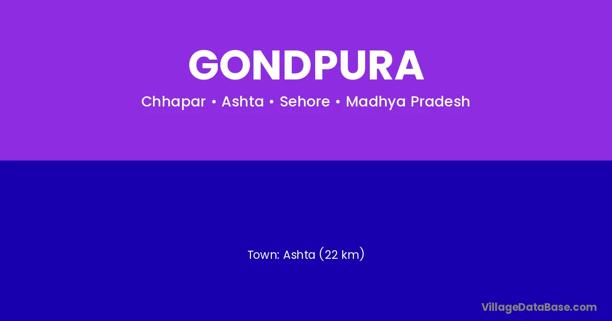 Ashta (22 km) is the nearest town to Gondpura village for major economic activities and is located approximately 22 km away.