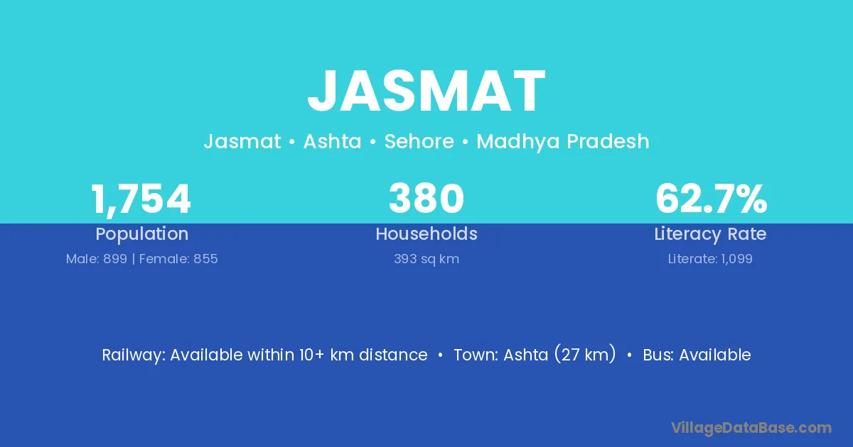 Ashta (27 km) is the nearest town to Jasmat village for major economic activities and is located approximately 27 km away.