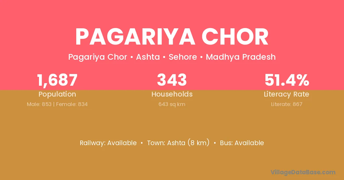Ashta (8 km) is the nearest town to Pagariya Chor village for major economic activities and is located approximately 8 km away.