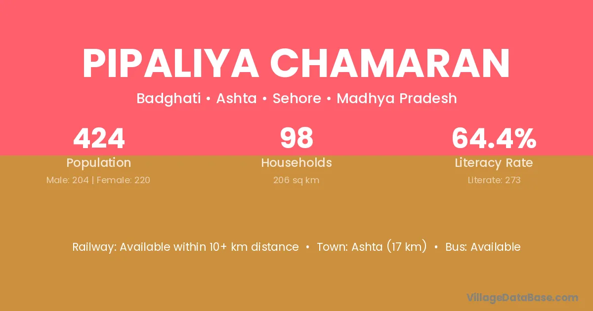 Ashta (17 km) is the nearest town to Pipaliya Chamaran village for major economic activities and is located approximately 17 km away.