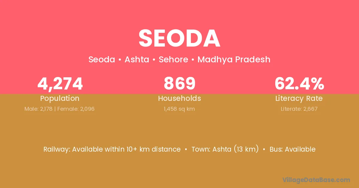 Ashta (13 km) is the nearest town to Seoda village for major economic activities and is located approximately 13 km away.