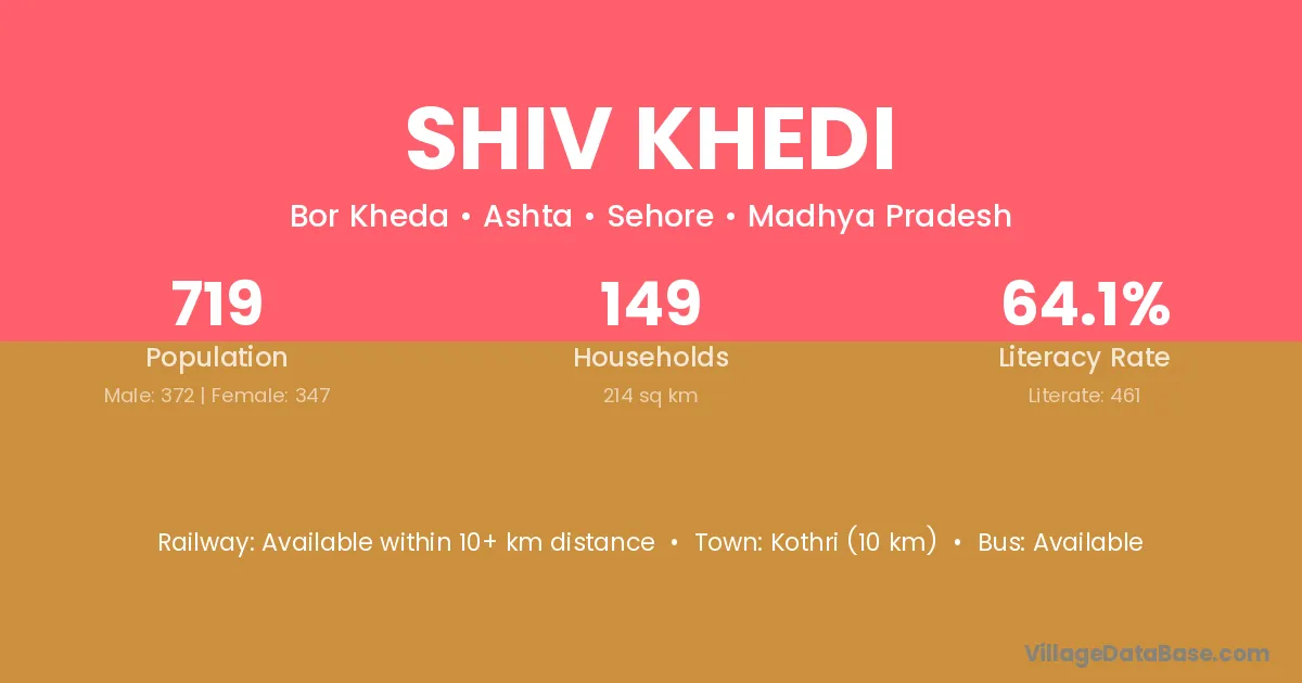 Kothri (10 km) is the nearest town to Shiv Khedi village for major economic activities and is located approximately 10 km away.