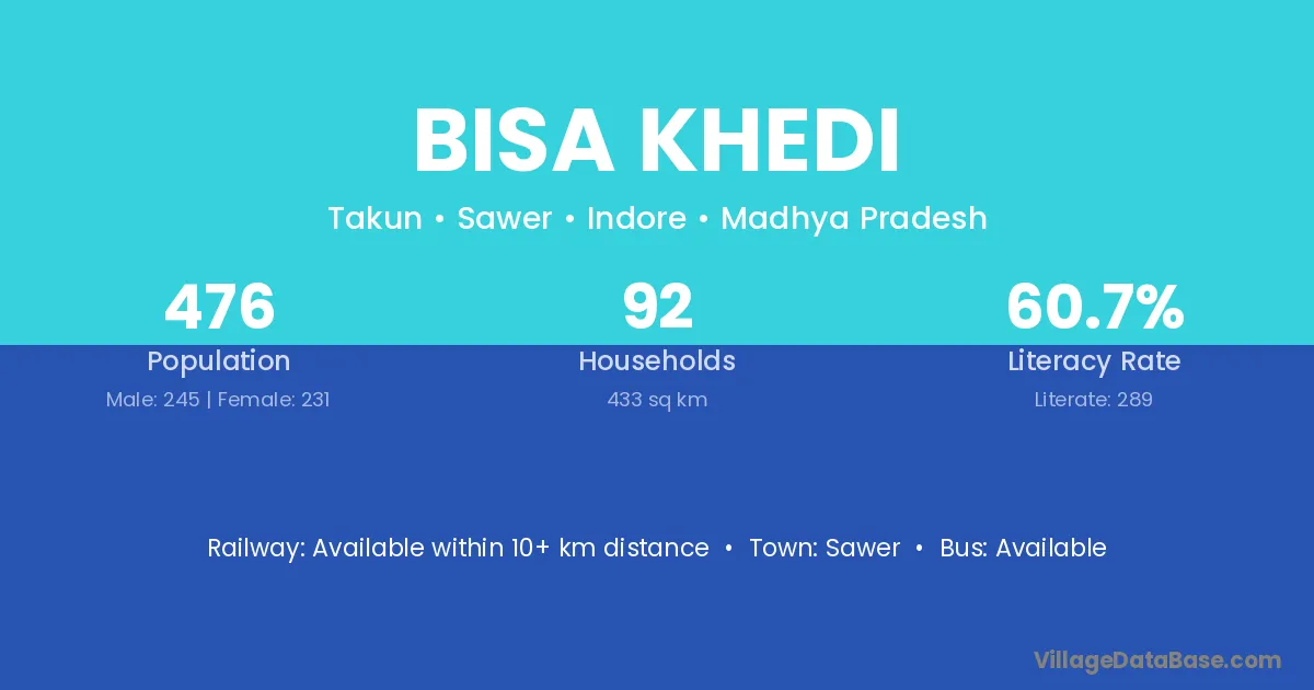 The literacy rate of Bisa Khedi village is 62.15%. Male literacy stands at 70.78% and female literacy at 52.24%.