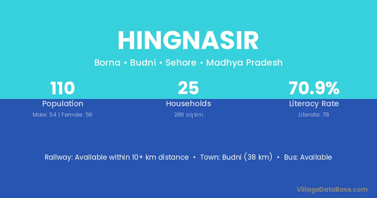 Budni (38 km) is the nearest town to Hingnasir village for major economic activities and is located approximately 38 km away.