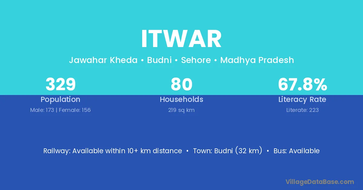 Budni (32 km) is the nearest town to Itwar village for major economic activities and is located approximately 32 km away.
