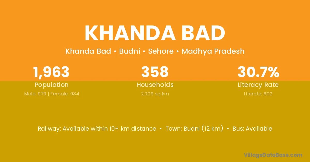 Budni (12 km) is the nearest town to Khanda Bad village for major economic activities and is located approximately 12 km away.