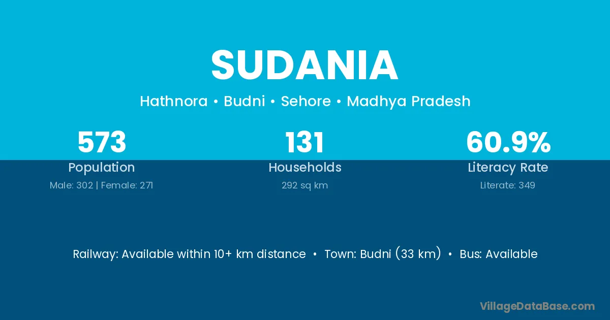Budni (33 km) is the nearest town to Sudania village for major economic activities and is located approximately 33 km away.