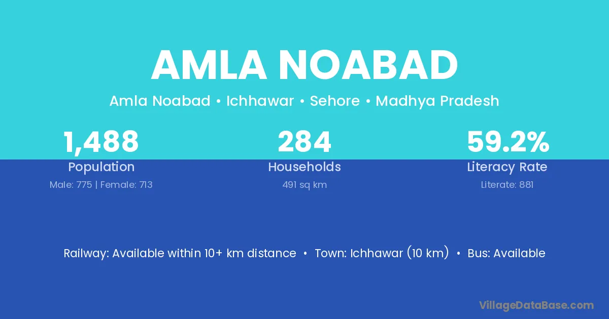 Ichhawar (10 km) is the nearest town to Amla Noabad village for major economic activities and is located approximately 10 km away.