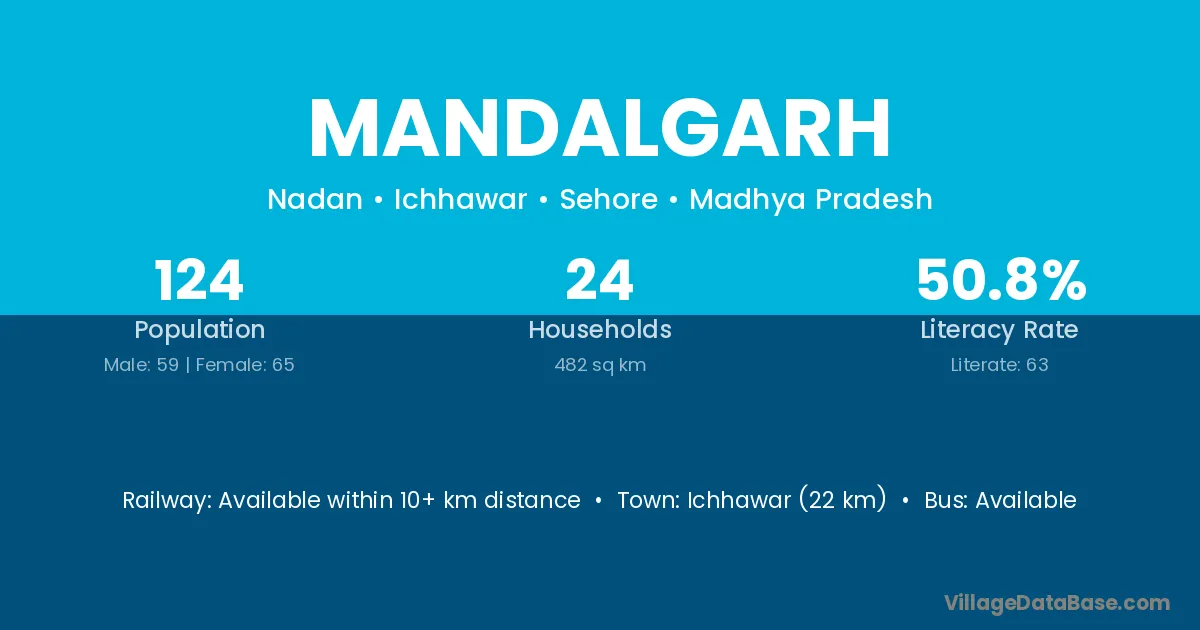 Ichhawar (22 km) is the nearest town to Mandalgarh village for major economic activities and is located approximately 22 km away.