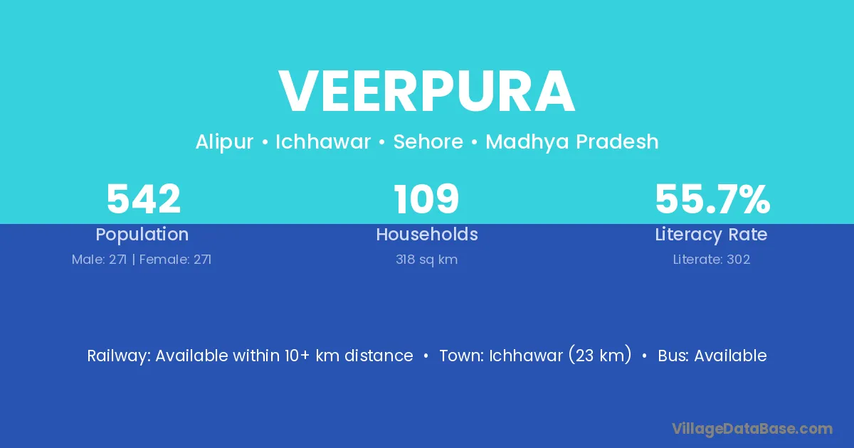 Ichhawar (23 km) is the nearest town to Veerpura village for major economic activities and is located approximately 23 km away.