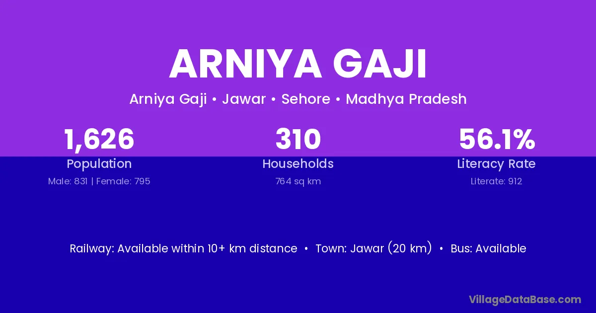 Jawar (20 km) is the nearest town to Arniya Gaji village for major economic activities and is located approximately 20 km away.