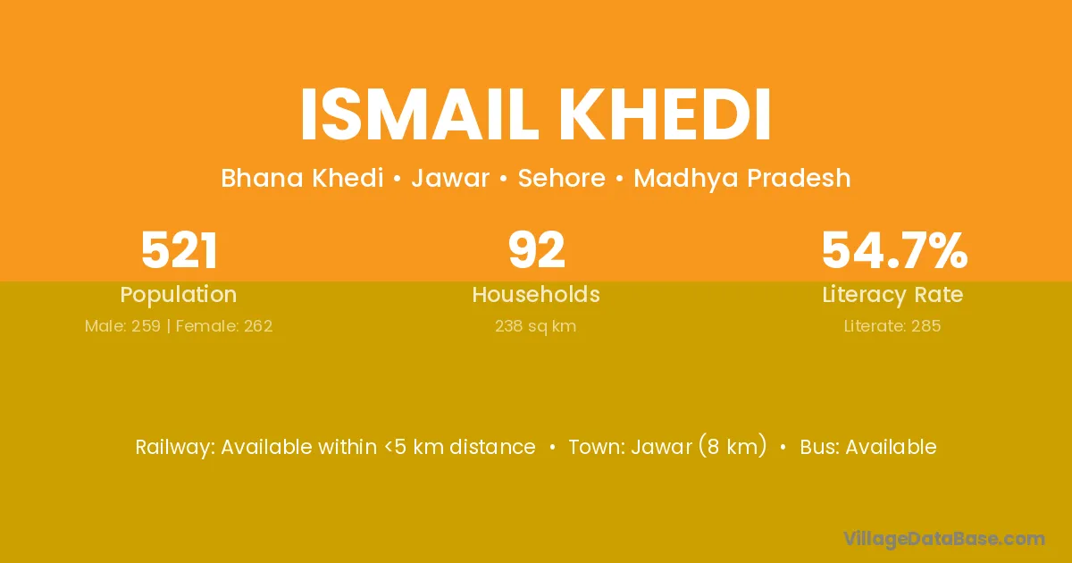Jawar (8 km) is the nearest town to Ismail Khedi village for major economic activities and is located approximately 8 km away.