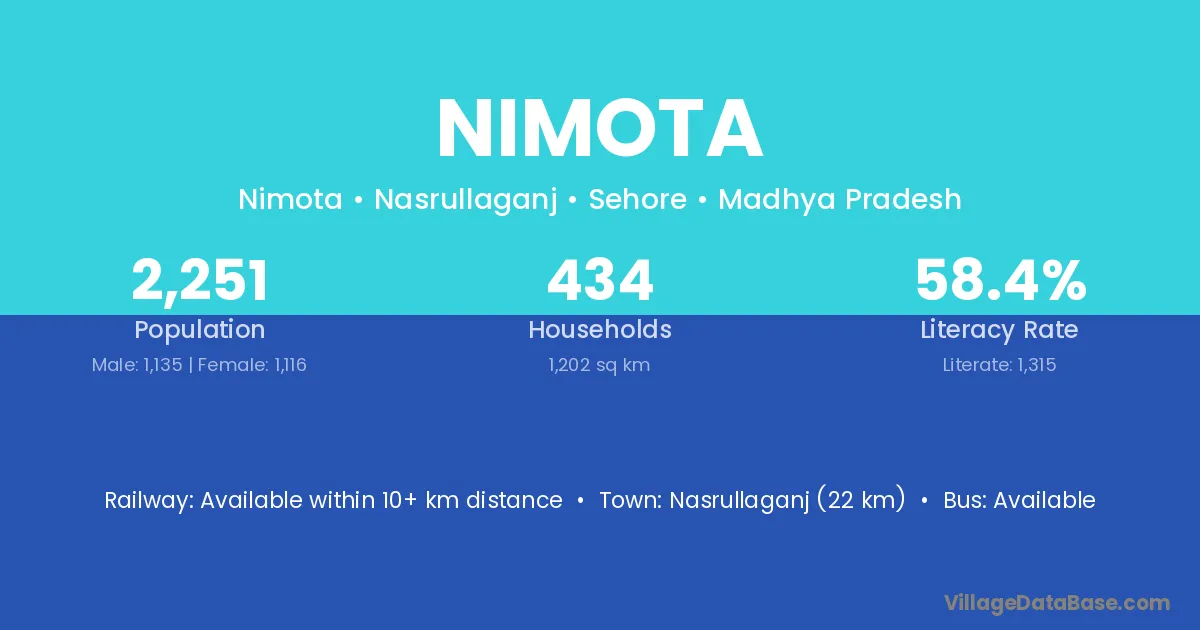 Nasrullaganj (22 km) is the nearest town to Nimota village for major economic activities and is located approximately 22 km away.
