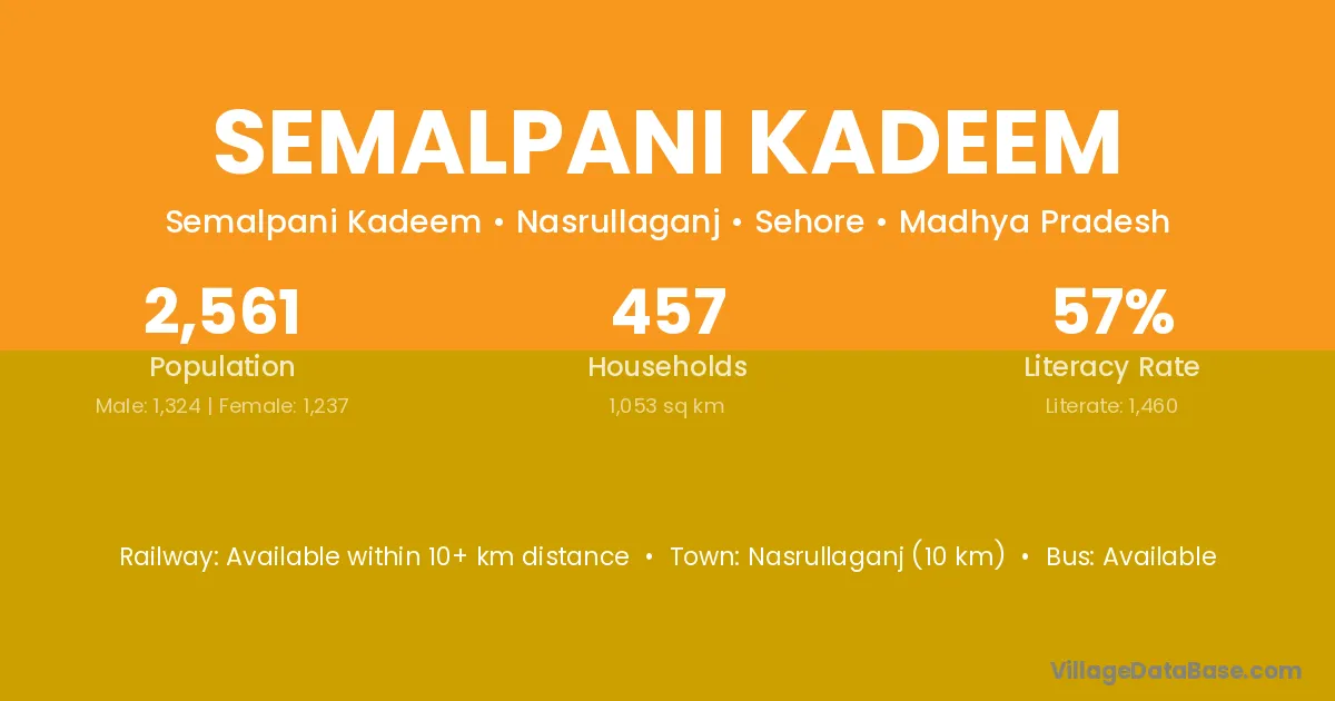 Nasrullaganj (10 km) is the nearest town to Semalpani Kadeem village for major economic activities and is located approximately 10 km away.