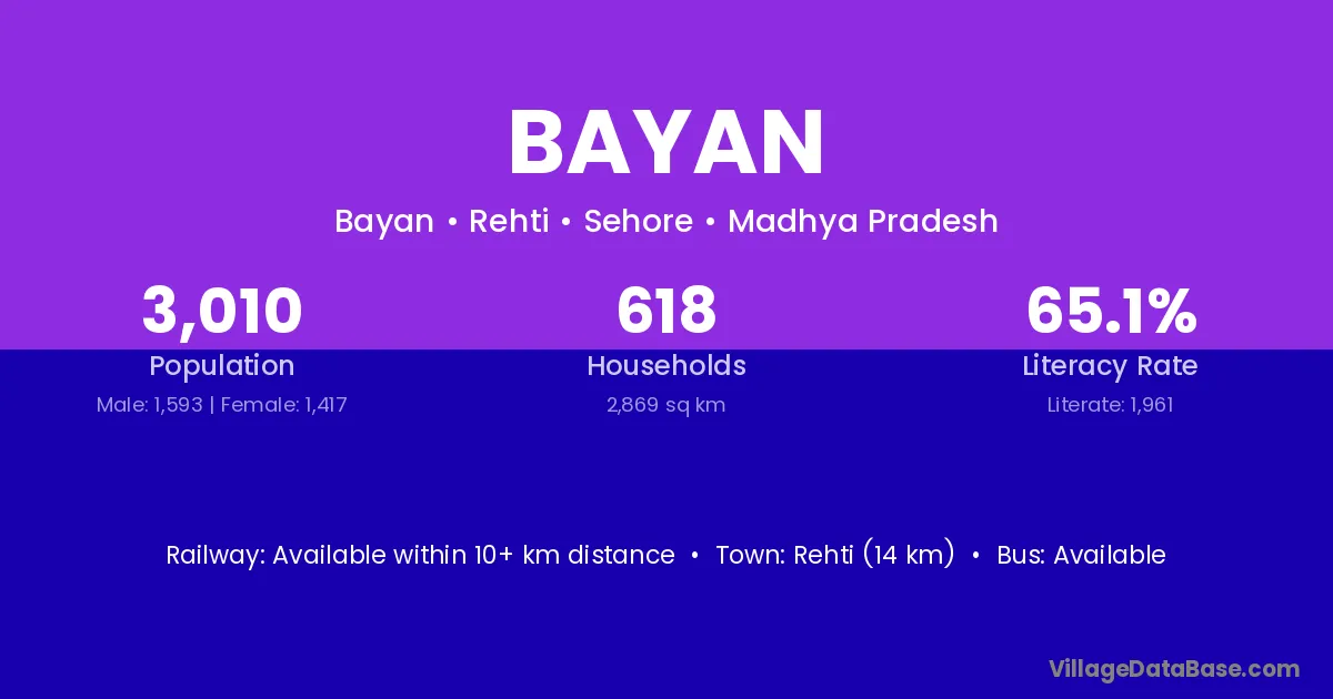 Bayan village has a total population of 3,010 people, of which 1,593 are males and 1,417 are females.