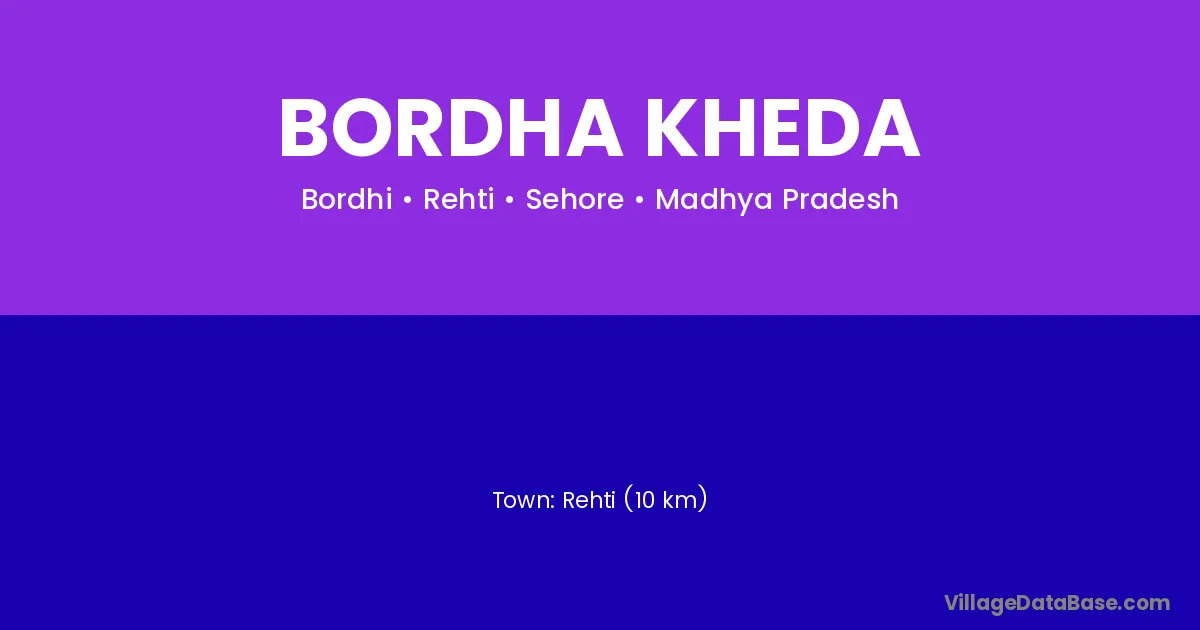 Rehti (10 km) is the nearest town to Bordha Kheda village for major economic activities and is located approximately 10 km away.