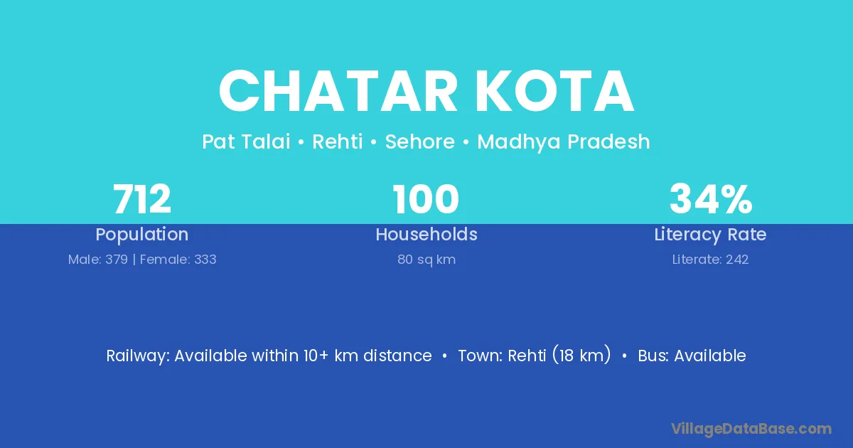 Rehti (18 km) is the nearest town to Chatar Kota village for major economic activities and is located approximately 18 km away.