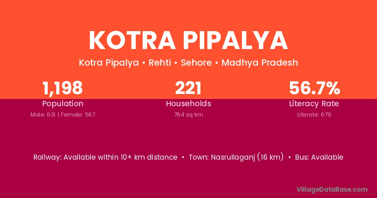 Nasrullaganj (16 km) is the nearest town to Kotra Pipalya village for major economic activities and is located approximately 16 km away.