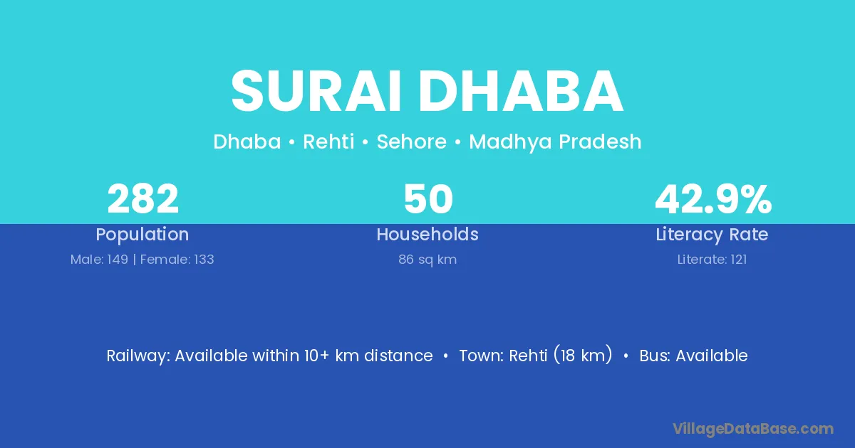 Rehti (18 km) is the nearest town to Surai Dhaba village for major economic activities and is located approximately 18 km away.
