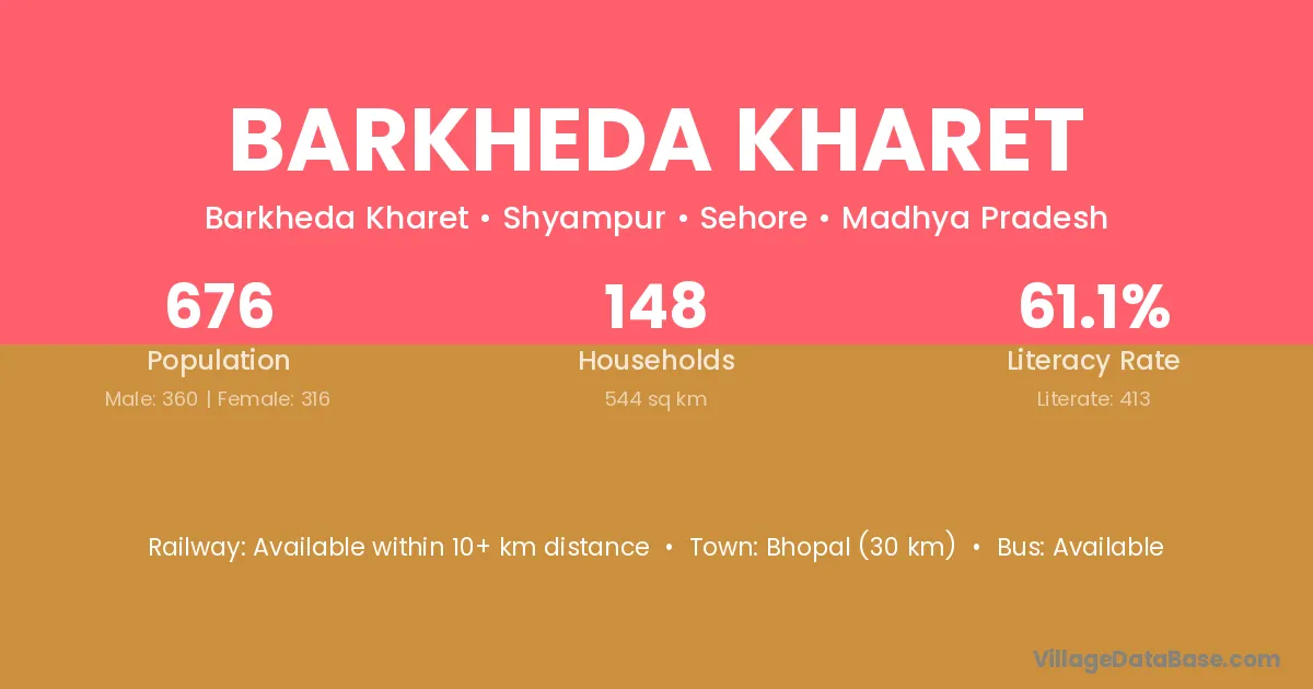 Barkheda Kharet village has a total population of 676 people, of which 360 are males and 316 are females.