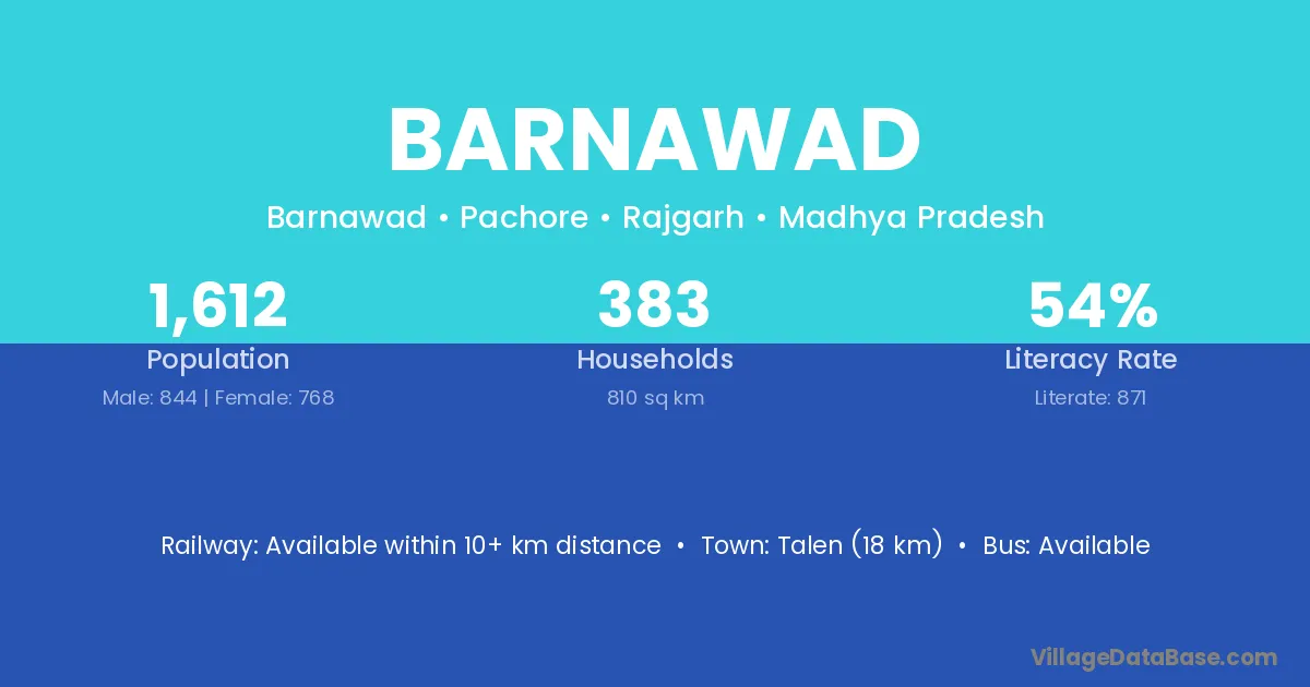 Narsinghgarh (26 km) is the nearest town to Barnawad village for major economic activities and is located approximately 26 km away.