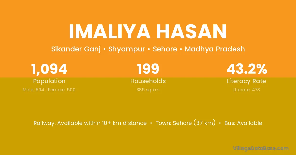 Sehore (37 km) is the nearest town to Imaliya Hasan village for major economic activities and is located approximately 37 km away.