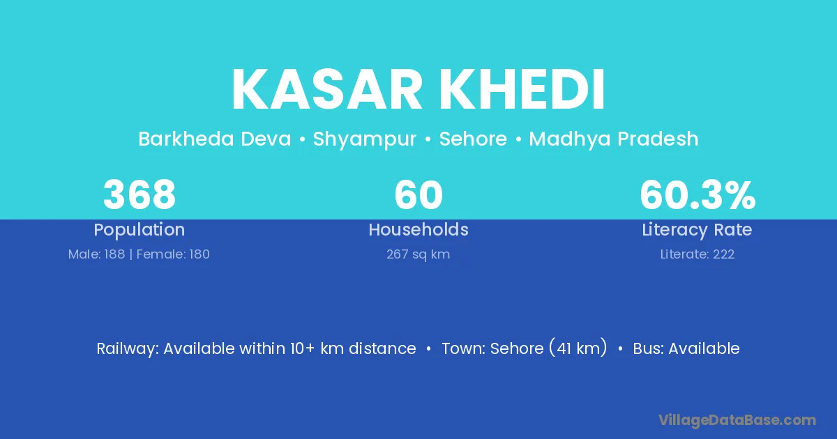 Sehore (41 km) is the nearest town to Kasar Khedi village for major economic activities and is located approximately 41 km away.