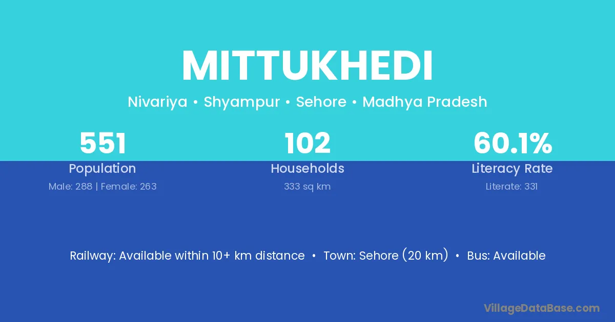 Sehore (20 km) is the nearest town to Mittukhedi village for major economic activities and is located approximately 20 km away.