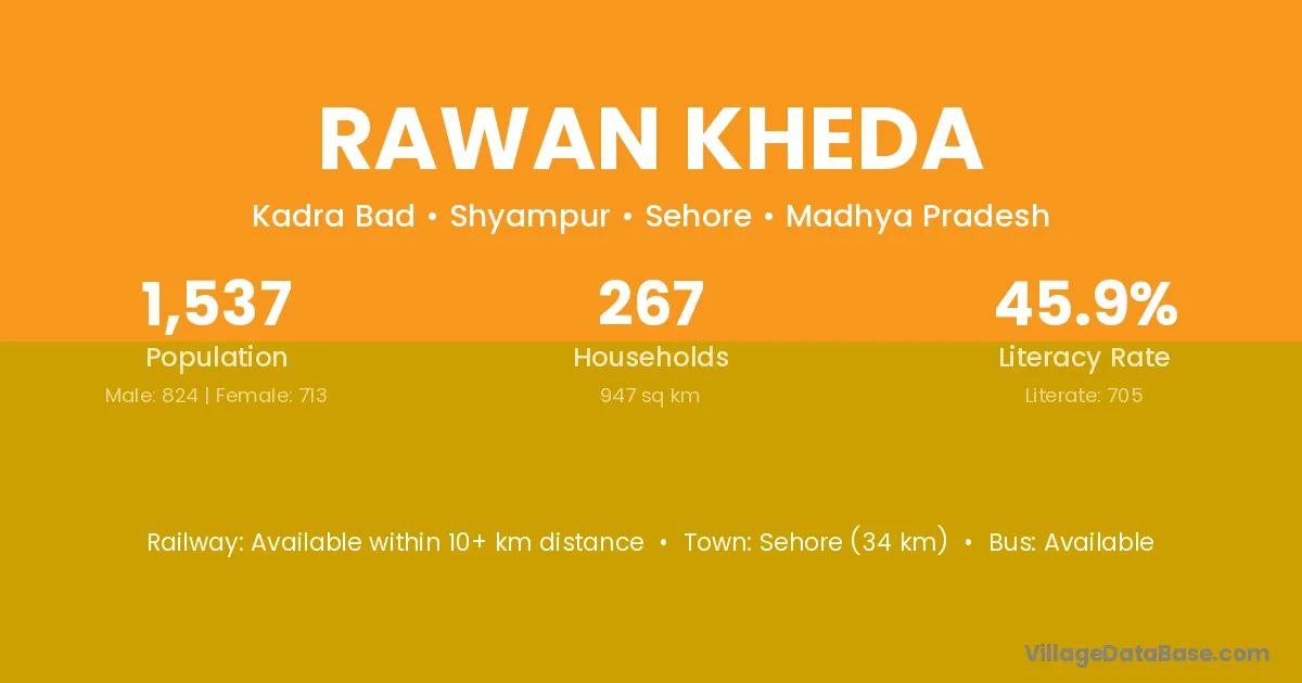 Sehore (34 km) is the nearest town to Rawan Kheda village for major economic activities and is located approximately 34 km away.