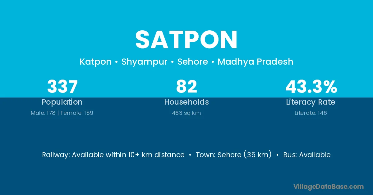 Sehore (35 km) is the nearest town to Satpon village for major economic activities and is located approximately 35 km away.