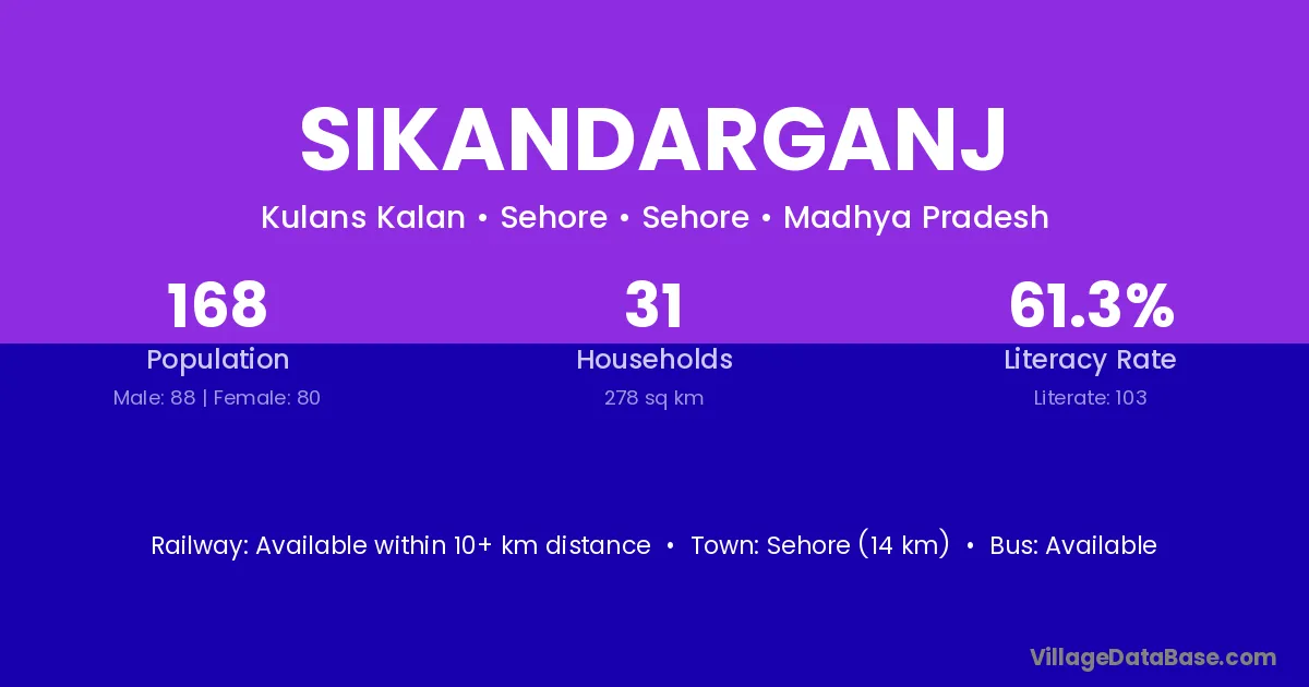 Sehore (43 km) is the nearest town to Sikandarganj village for major economic activities and is located approximately 43 km away.