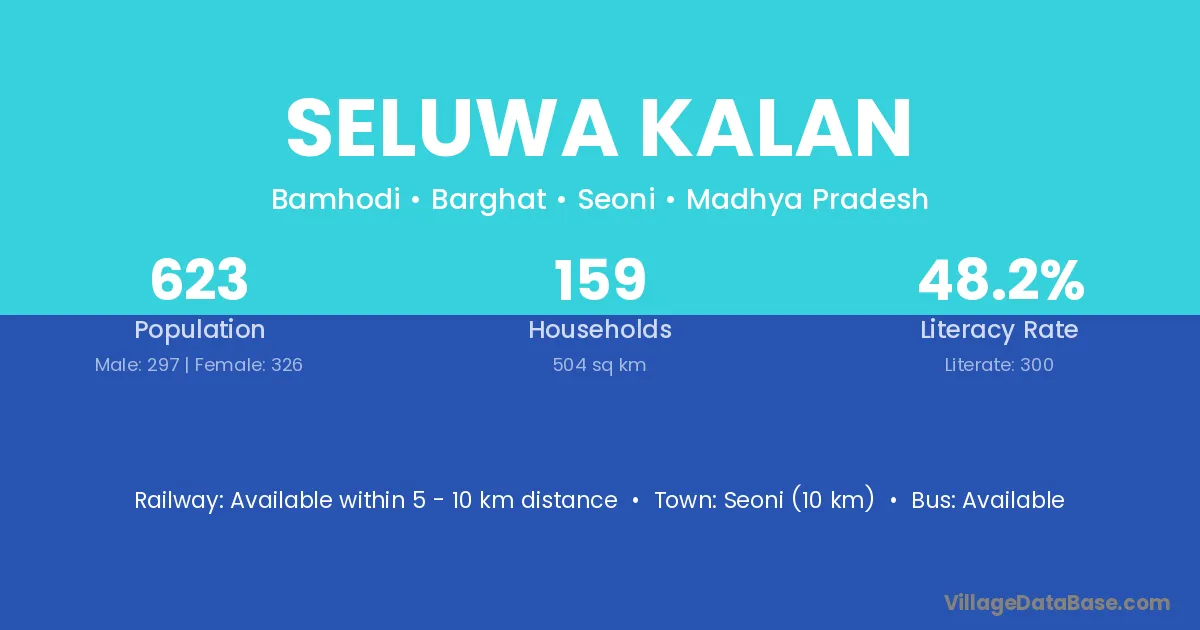 Seoni (10 km) is the nearest town to Seluwa Kalan village for major economic activities and is located approximately 10 km away.