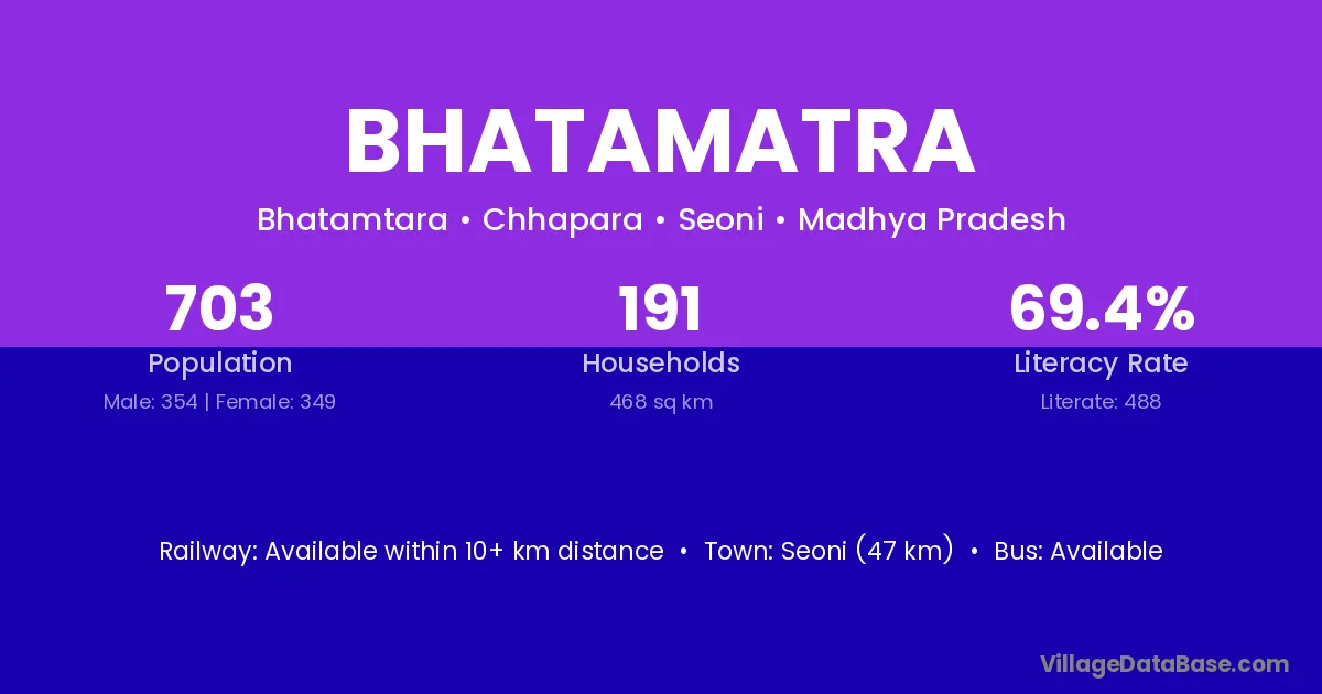 Seoni (47 km) is the nearest town to Bhatamatra village for major economic activities and is located approximately 47 km away.