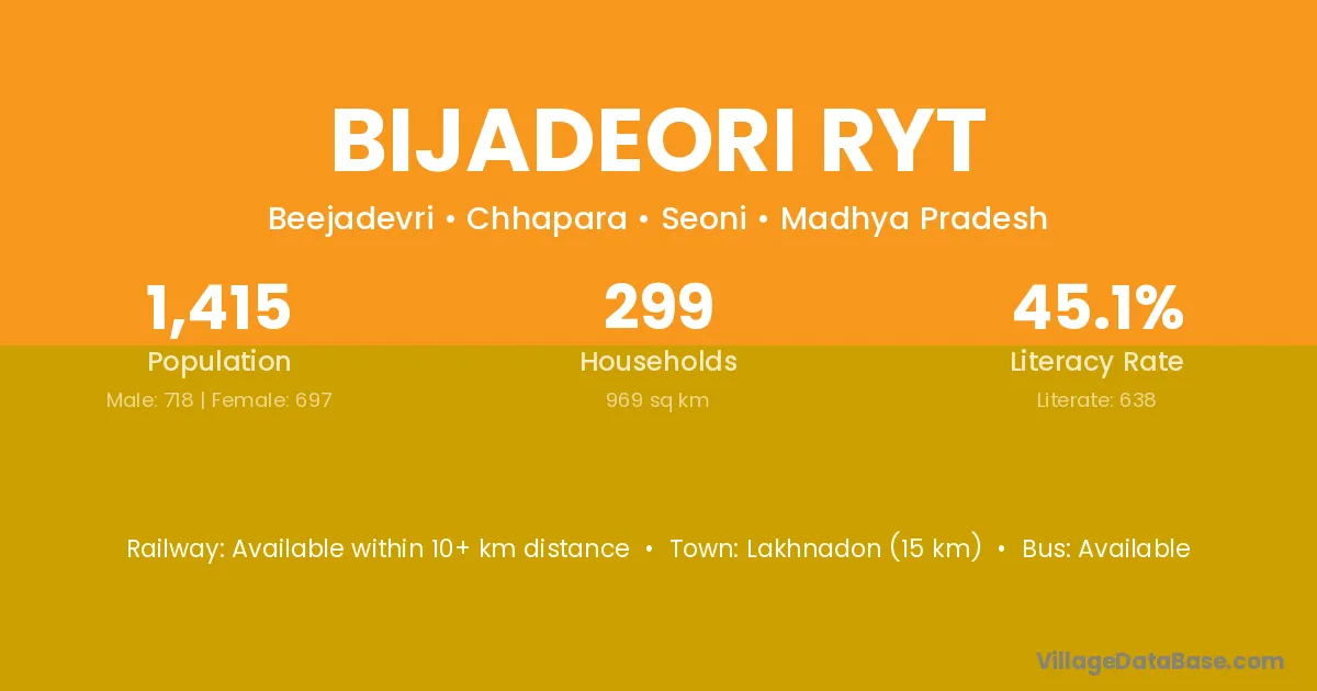 Lakhnadon (15 km) is the nearest town to Bijadeori Ryt village for major economic activities and is located approximately 15 km away.