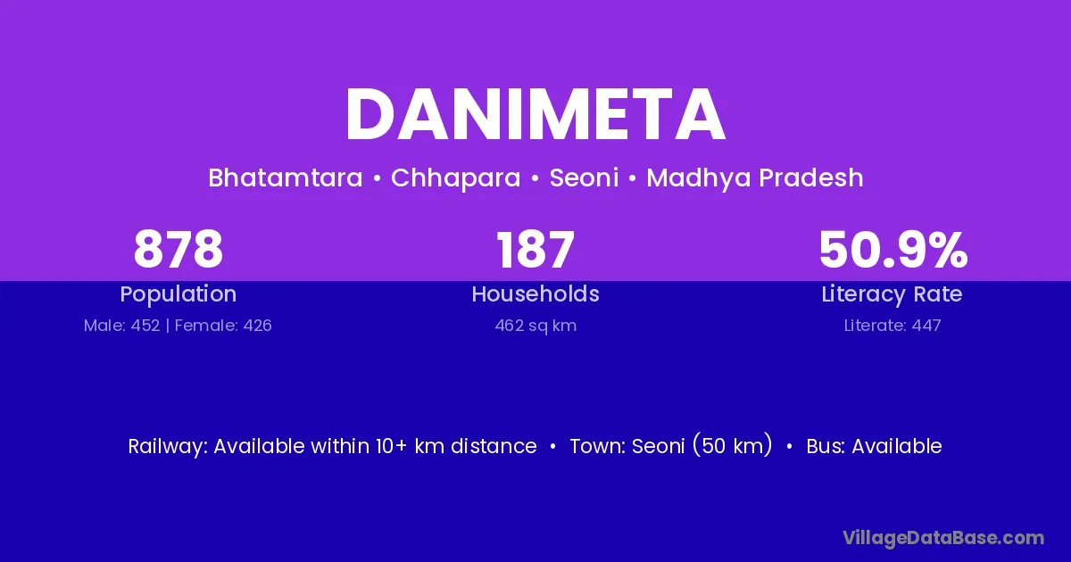 Seoni (50 km) is the nearest town to Danimeta village for major economic activities and is located approximately 50 km away.